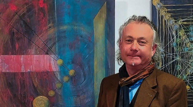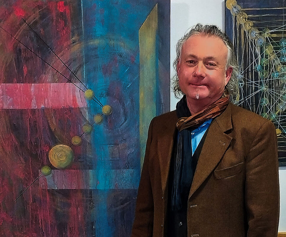 Christoph Sax vor seinen Gemälde »Goldene Zeiten« (links) und »Netzwerk«