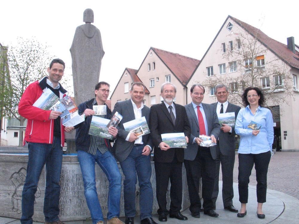 Teamwork für die Image-Kampagne der Stadt (von links): Markus Mittner, Olaf Nagel und Martin Benz von der Medienagentur Kontrast plus, Bürgermeister Rudolf Heß, Martin Fink (Büro Personal-Kultour), Ulrich Fink (Druckerei Fink) und Sabine Hohloch vom Amt für Kultur, Sport und Öffentlichkeitsarbeit der Stadt.