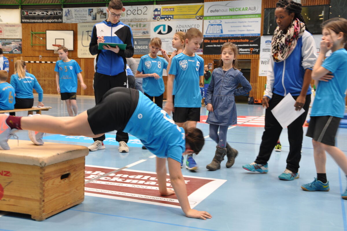 Krafttest für die Arme: Bei der Handball-Talentiade umrundeten die jungen Sportler einen Kasten im Liegestütz. FOTO: BIMEK