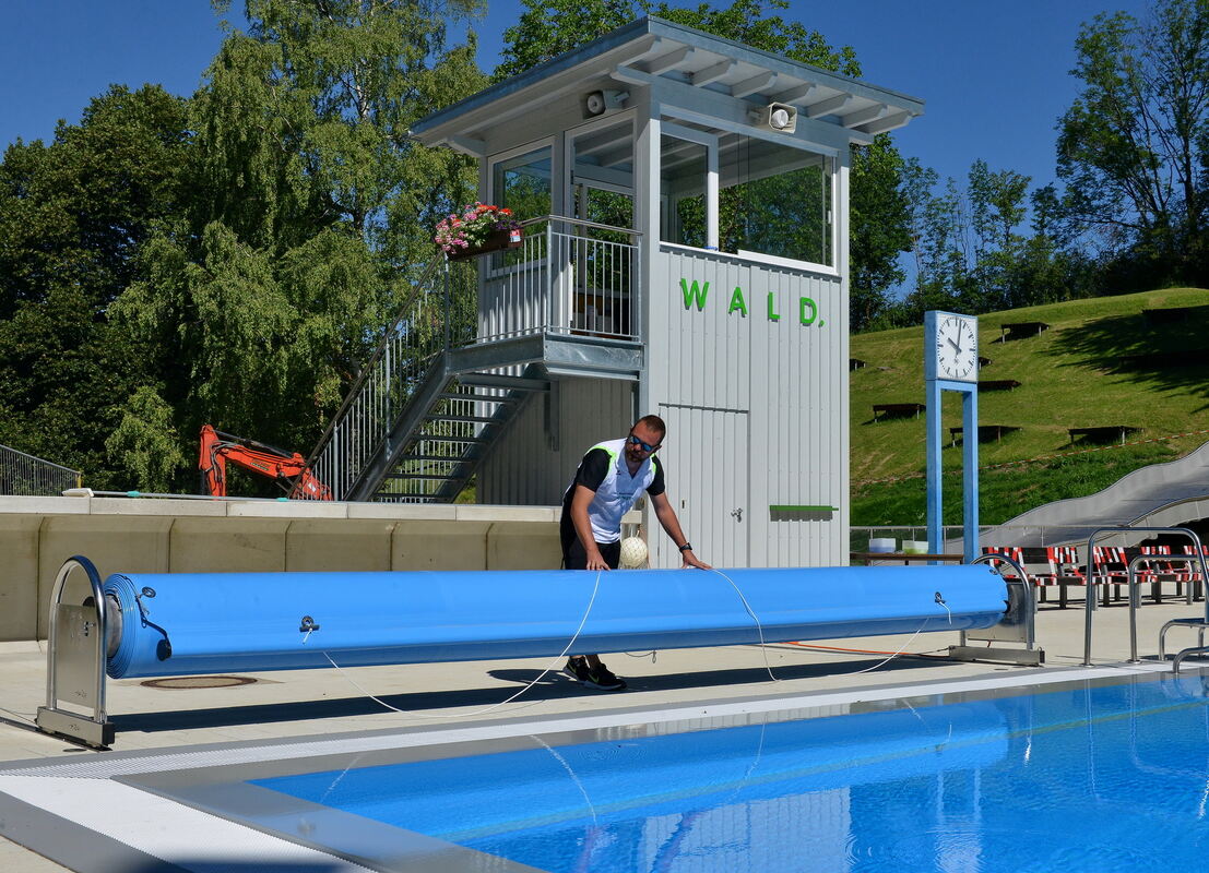 Fabian Kock, Betriebsleiter des Waldfreibads, hofft, dass durch einen vorausschauenden Einsatz von Solarabsorbern und Beckenabdeckung auch bis zum Saisonende am Sonntag, 18. September, vollständig auf den Einsatz von Erdgas verzichtet werden kann.