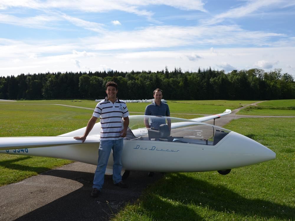 Vor dem Start die Vorbereitungen: Dominik Senner (links) und Michael Bauer haben zunächst das Segelflugzeug zusammengebaut, das wenige Gepäck verstaut und die Tragflächen mit Wasser gefüllt.