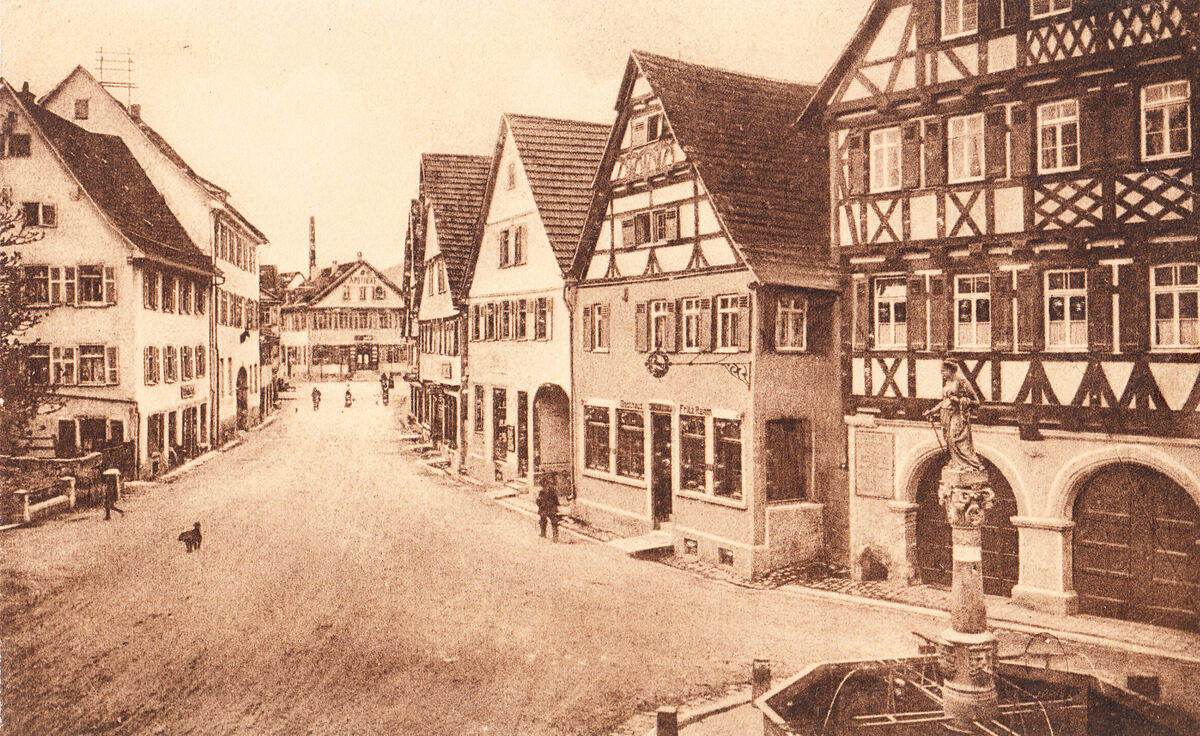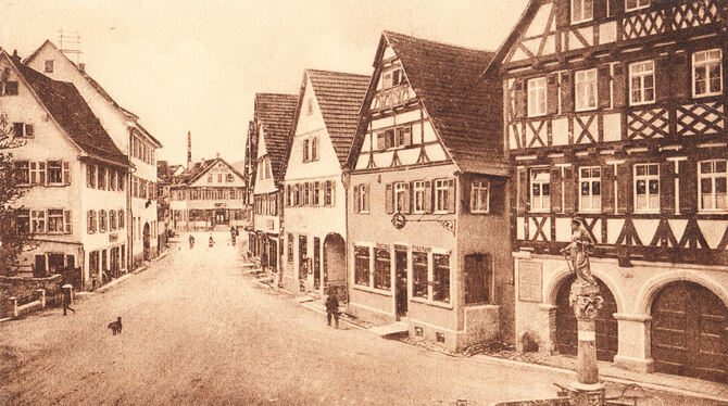 Das »Rössle« (mit Schild) um 1914: An der schon damals historischen Gaststätte führte die Staatsstraße vorbei.