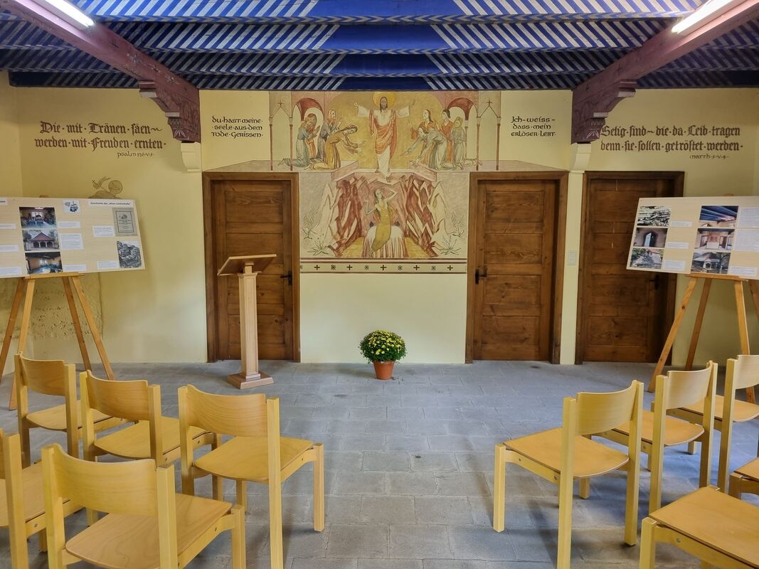 Von 11 bis 17 Uhr wird in der alten Aussegnungshalle auf Schautafeln die bewegte Geschichte der Aussegnungshalle präsentiert. Die Besucher können die liebevoll restaurierten Fresken des Innenraums bewundern und mehr über das Gebäude und die Wandbemalungen erfahren. Um 16 Uhr beginnt eine ökumenische Andacht mit Pfarrerin Katharina Dolmetsch-Heyduck und Pastoralreferentin Amelie Zimmer mit anschließendem Segensspruch für die alte Aussegnungshalle und die Menschen auf dem Friedhof. Nach einem Grußwort von Bürgermeister Peter Nußbaum gibt Gert Lindemann vom Geschichts- und Heimatverein einen kurzen geschichtlichen Abriss zum Friedhof und der Aussegnungshalle. Musikalisch begleitet wird die Andacht vom Violinduo Manuela Eiche und Katharina Dolmetsch-Heyduck. Im Anschluss an die ökumenische Feier stehen Bürgermeister Peter Nußbaum sowie die Kirchen- und Vereinsvertreter für Fragen zur Verfügung. Danach lädt die bürgerliche Gemeinde zu einem Ständerling ein.