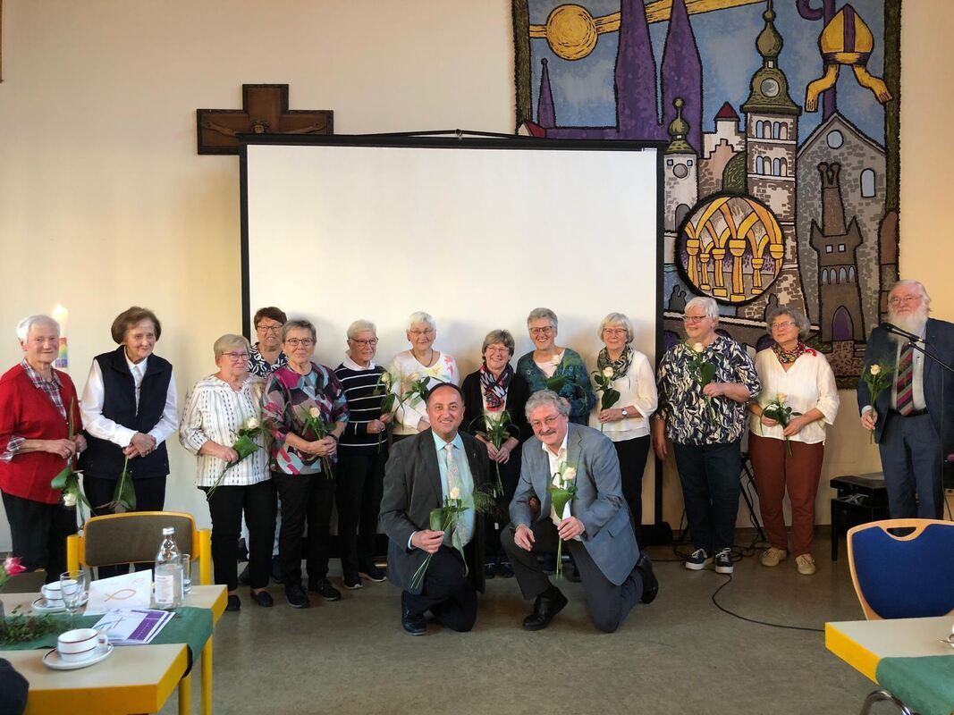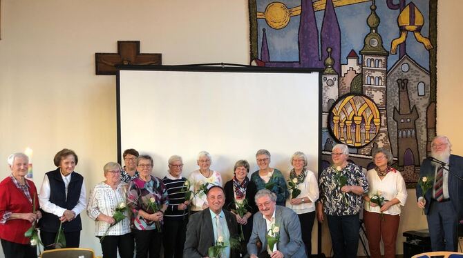 Dekan Friedl und Pfarrer Fetzer erzählten auf heitere Weise von der Entstehung des ökumenischen Echaztreffs, das »Bronnweiler Weib« Friedel Kehrer-Schreiber trat mit Charme, Witz und Humor auf, es gab einen Sektempfang, dazu selbst gebackene Minibrötchen, eine Festtagstorte, eine rückblickende Fotoschau, spirituelle Impulse mit Gedenken an die verstorbenen Mitglieder, Lieder und Musik, sogar ein Pianist vom Mozarteum in Salzburg gastierte bei diesem doppelten Anlass zum Feiern. Die beiden Geistlichen bedankten sich jeweils mit einer Rose bei allen Mitwirkenden, besonders beim ökumenischen Frauenteam, einschließlich derer, die altershalber aus dem Vorbereitungsteam ausgestiegen sind. (eg)