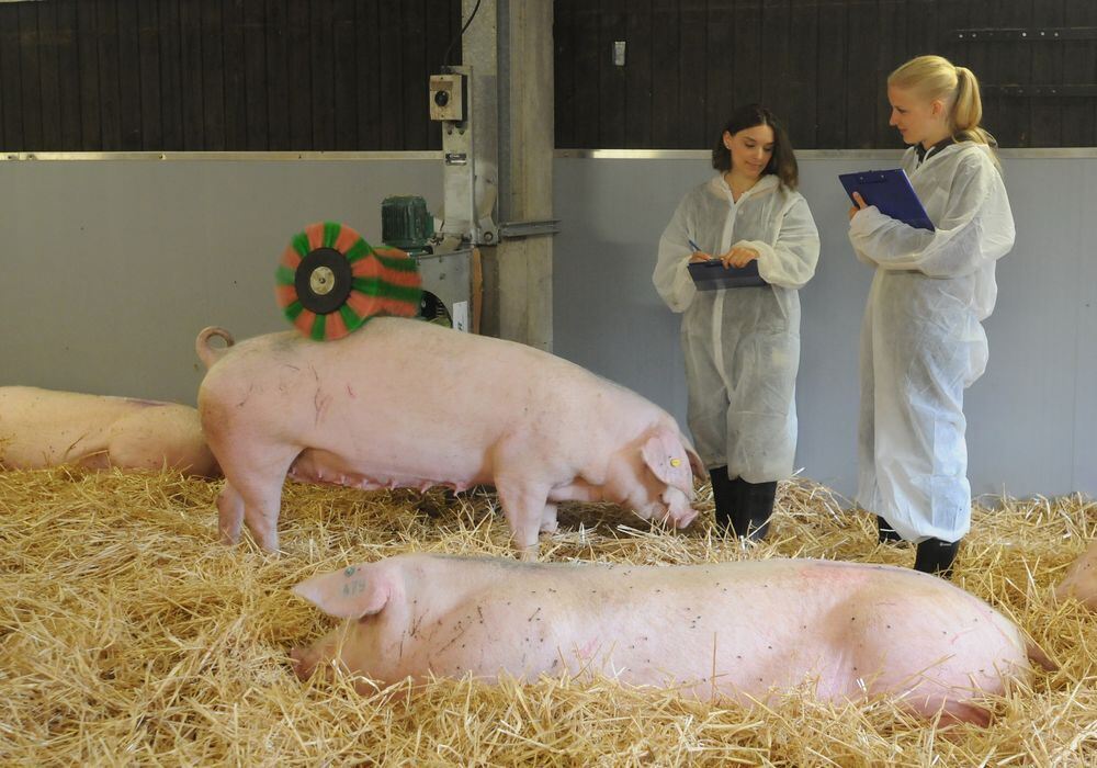 Wellnessstall für tragende Sauen mit Schubberbürste und reichlich Stroheinstreu. Die Sauen stehen unter Videobeobachtung, damit die Wissenschaftlerinnen auswerten können, wann und wie oft das Komfort- und Beschäftigungsangebot im Stall genutzt wird und ob sich die Tiere damit wohler fühlen als ohne. GEA-FOTO: JÜRGEN MEYER