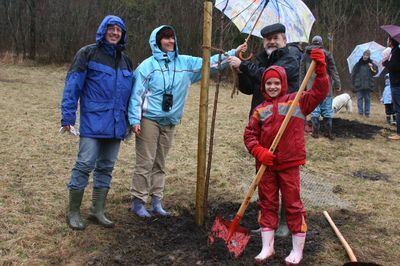 Die Familie Neubrander mit Tochter Lea und Bürgermeister Rudolf Heß (mit Regenschirm) bei der Pflanzaktion.