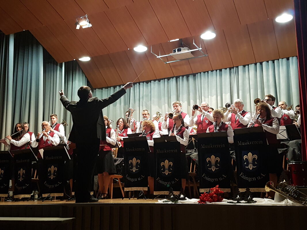 Sergej Saika dirigiert das Jahresabschlusskonzert der Jugendkapelle und der aktiven Kapelle des Eninger Musikvereins. FOTO: HEHN