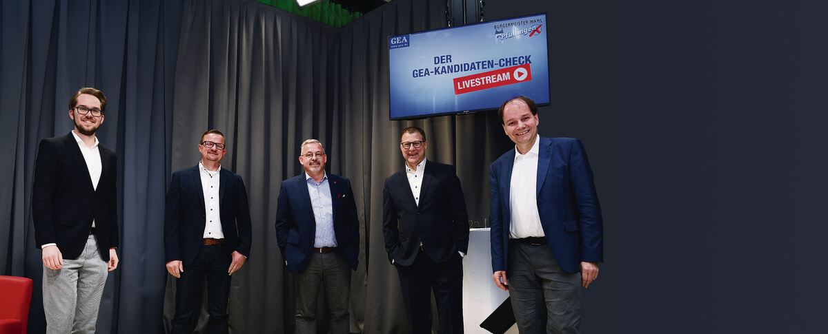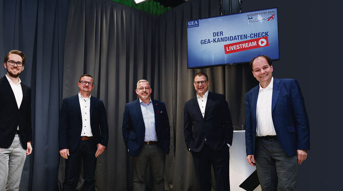 Fünf Bewerber für das Bürgermeisteramt in Pfullingen (von links): Timo Plankenhorn, Stefan Wörner, Sven Bohnert, Detlev Gottaut, Martin Fink.
