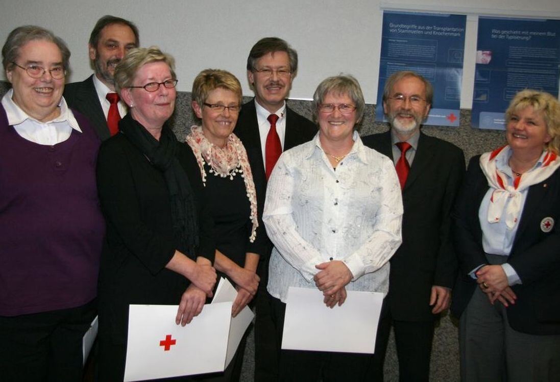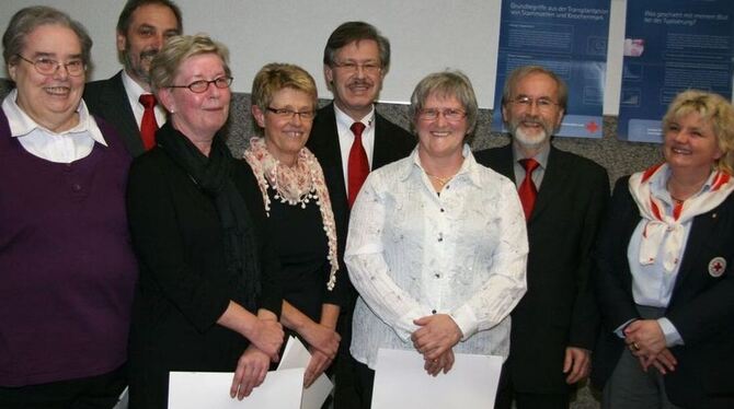Promis und langjährige Aktive des DRK-Ortsvereins (von links): Marianne Schmid, Hubert Gulde, Edelgard Plankenhorn, Elke Gulde, Dieter Hillebrand, Barbara Sättele, Bürgermeister Rudolf Heß und Kreisbereitschaftsleiterin Christiane Voß.