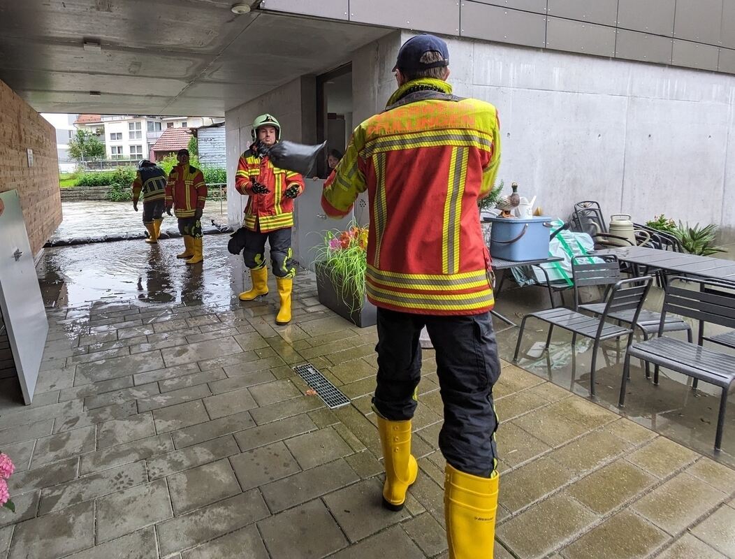 Das Wasser der Echaz kommt bis ans Haus. Die Feuerwehr Pfullingen ist zur Stelle und verlegt Sandsäcke mittels einer Menschenkette.