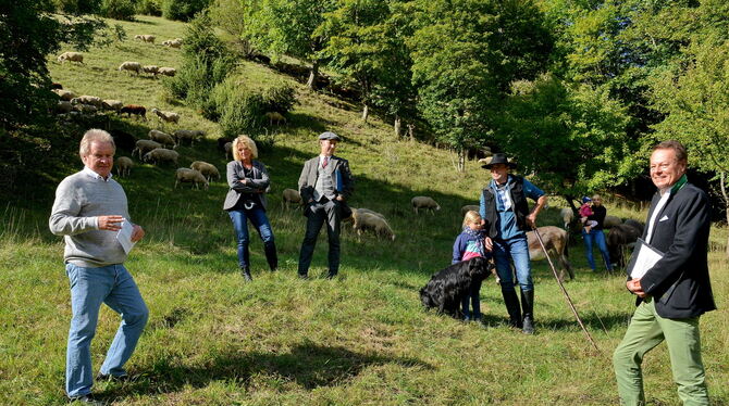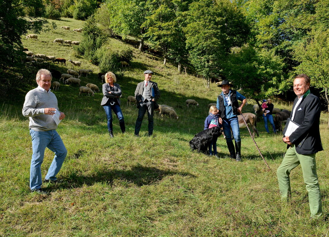 Minister auf der Schafweide (von links): Franz Untersteller, Anette Wohlfahrt vom Landesschafzuchtverband, Projektbearbeiter Dr. Florian Wagner, Schäfer Markus Rehm und Regierungspräsident Klaus Tappeser im Naturschutzgebiet Hohenäcker-Imenberg.