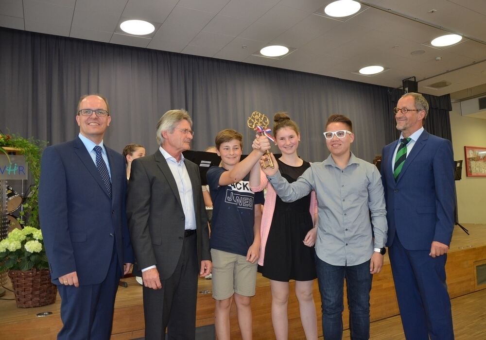 Schlüsselübergabe für den Erweiterungsbau der WHR Pfullingen (von links): Bürgermeister Michael Schrenk, Architekt Bernhard Amann, die Schülersprecher Louis Griumme, Jule Glück und Meark Mende sowie Schulleiter Jürgen Albrecht.