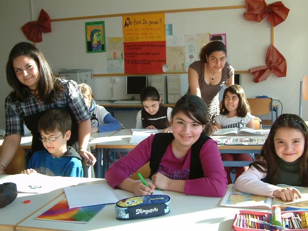 Hausaufgabenbetreuung für Viertklässler mit Betreuerinnen Gamze Özdemir (Vordergrund mit karierter Bluse) und Didem Uymaz (Hintergrund).