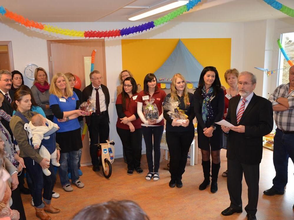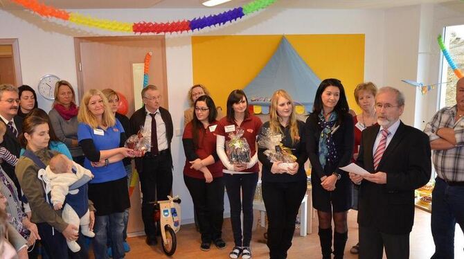 Die künftigen Nutzer der Kita waren nur ganz vereinzelt bei der Einweihung mit dabei. Bürgermeister Rudolf Heß (rechts) freute sich über die neue Einrichtung, neben ihm »Denk-mit!«-Geschäftsführerin Karin Bader mit ihrem Team.