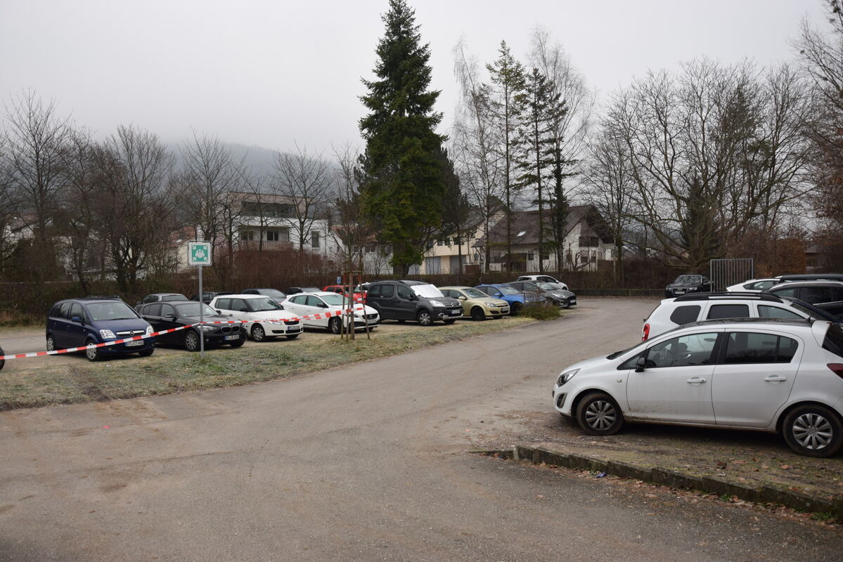 Wo jetzt noch ein Parkplatz ist, soll bis zum Herbst eine Wohnanlage in Holzelementbauweise für bis zu 98 Menschen entstehen. Direkt hinter dem Parkplatz verläuft der Radweg auf der ehemaligen Bahntrasse, jenseits liegt das Wohngebiet Entensee. FOTO: SCHÖBEL