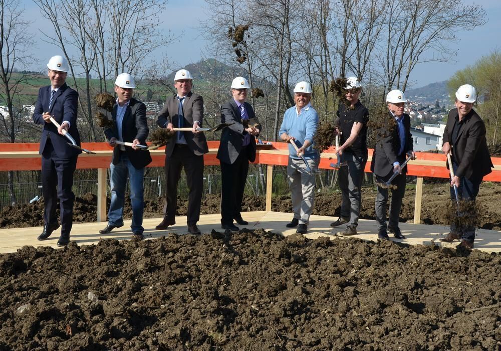 Gute gelaunt bei bestem Wetter waren die Gäste beim Spatenstich. Vierter von links Bürgermeister Michael Schrenk, rechts neben ihm Thomas Bamberg, links Claudius Rall.