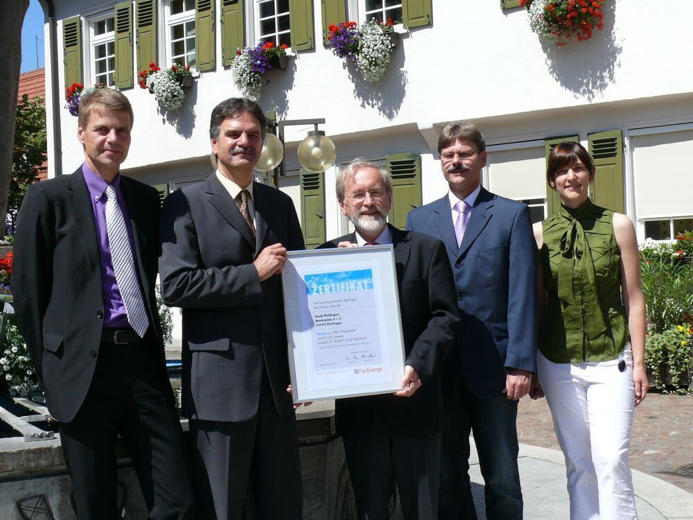 Künftig Strom aus Wasserkraft: Über das Zertifikat freuen sich (von links) Günter Stumpfernagel, Leiter Handel bei Fair-Energie, der Kaufmännische Geschäftsführer Heiko Suter, Bürgermeister Rudolf Heß, Wolfram Auch und Daniela Schobel von der Stadt Pfullingen. FOTO: PR