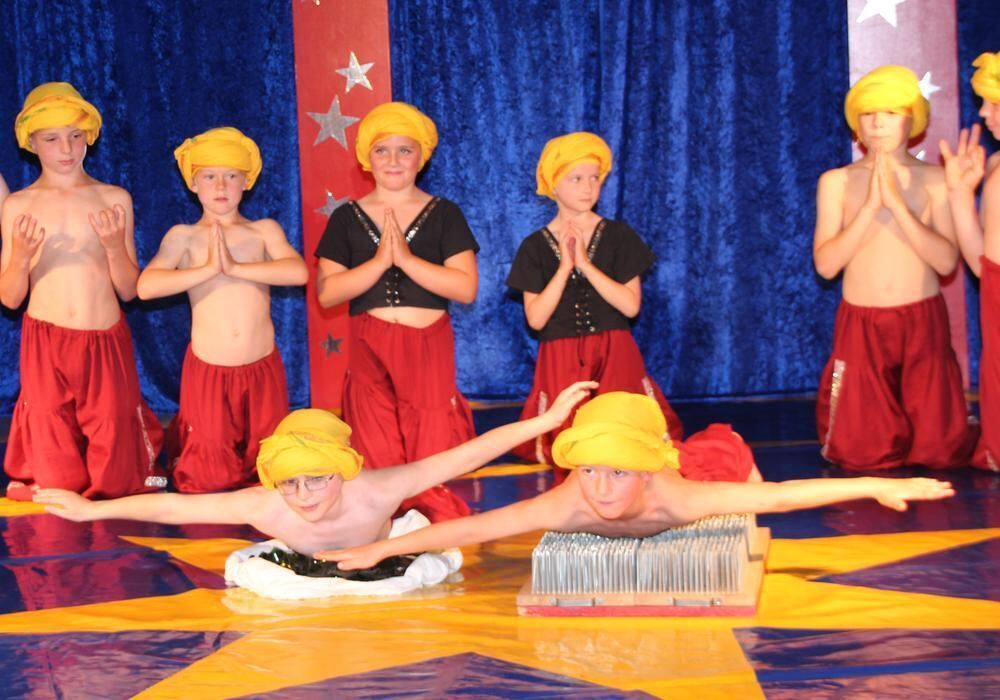 Auf Nagelbrett und Glasscherben: Die Fakir-Truppe vom Zirkus Abeba beim großen Auftritt. FOTO: LEIPPERT