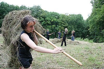 Beim Heuen: Schülerinnen und Schüler der Pfullinger Schloss-Schule auf der Trollblumenwiese.
