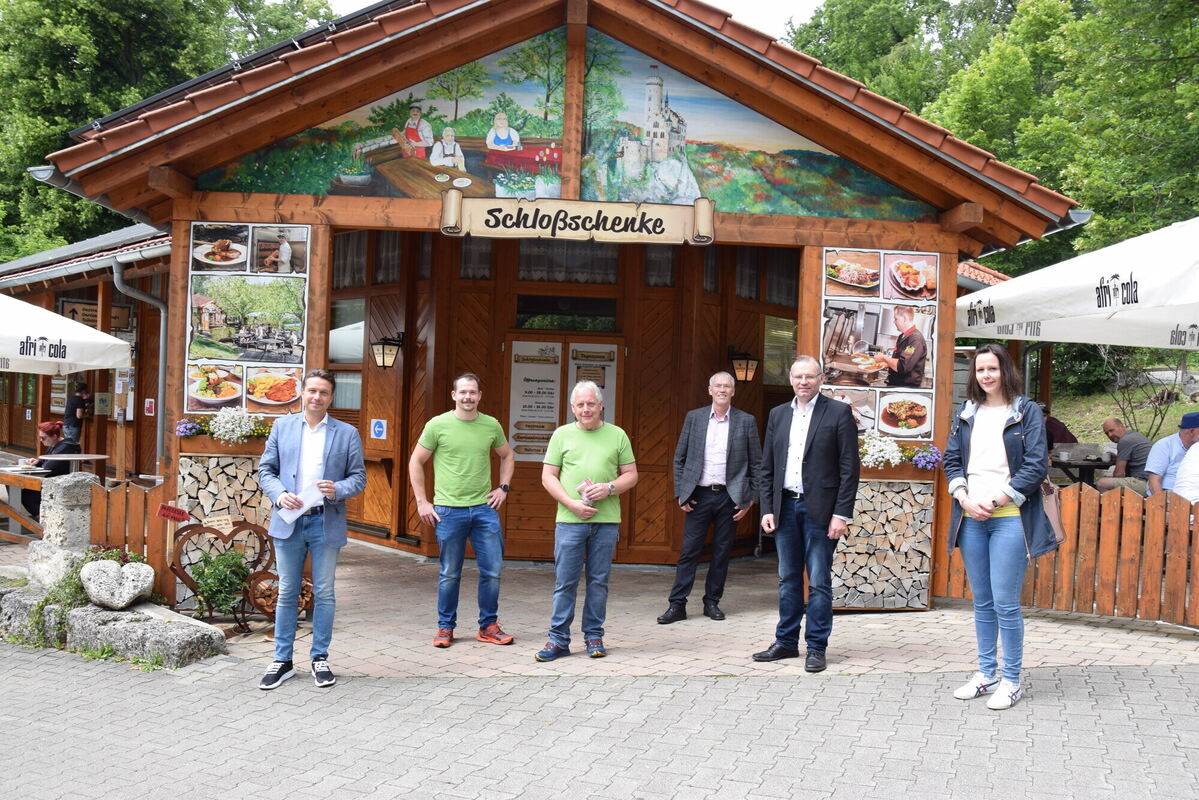 Die Besitzer der Schloßschenke Thomas und Jochen Etter (in Grün, von links) bekamen Besuch von (von links) Manuel Hailfinger, Vorsitzender des CDU-Kreisverbands, Dr. Uwe Schloßer von der Kompetenzstelle Energieeffizienz Neckar-Alb, Norbert Lins, Mitglied des Europaparlaments, und Elisabeth Markwardt, Regionalmanagerin im Leader-Aktionsgebiet Mittlere Alb. FOTO: HAILFINGER