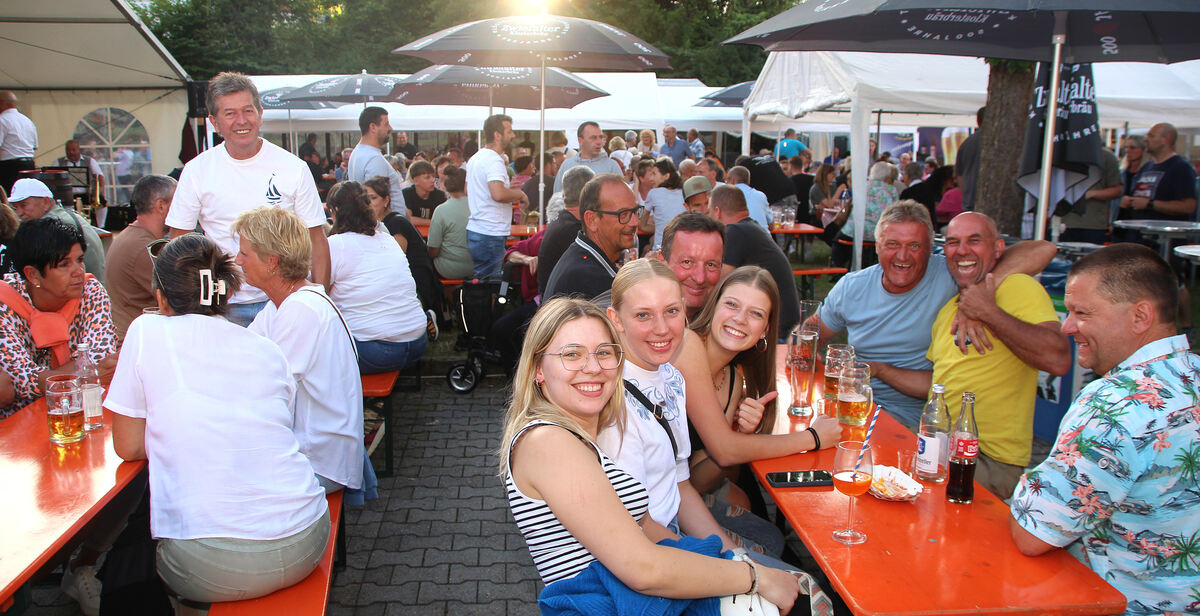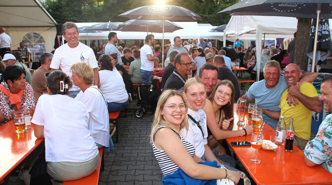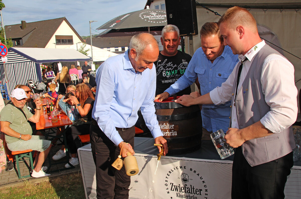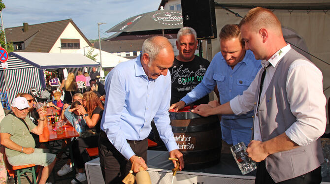 Dem stellvertretenden Bürgermeister Samir Halabi (links) gelang sein erster Fassanstich in drei Schlägen, hinter ihm (von links) der zweite stellvertretende Bürgermeister Steffen Schmälzle, der Zwiefalter-Brauereichef Peter Baader sowie Ortsvorsteher Thomas Gauß.
