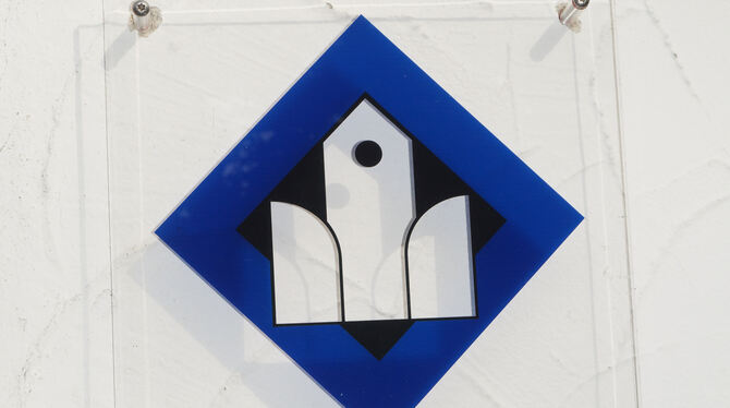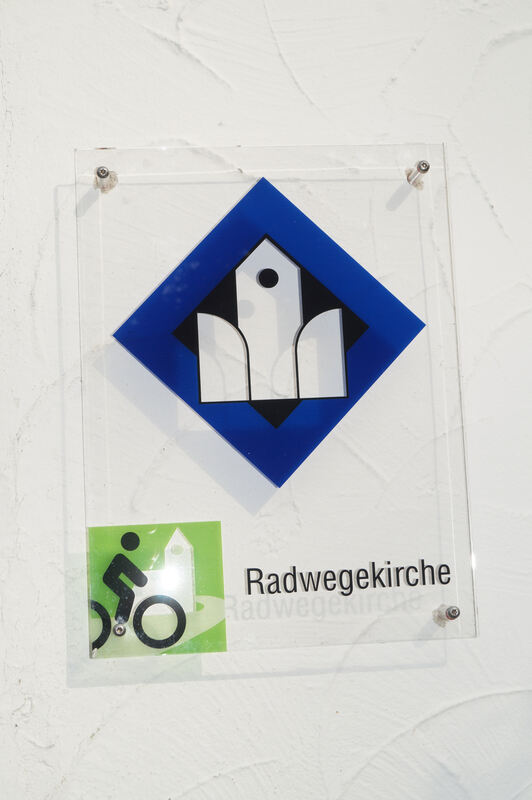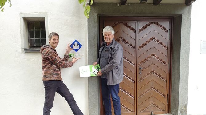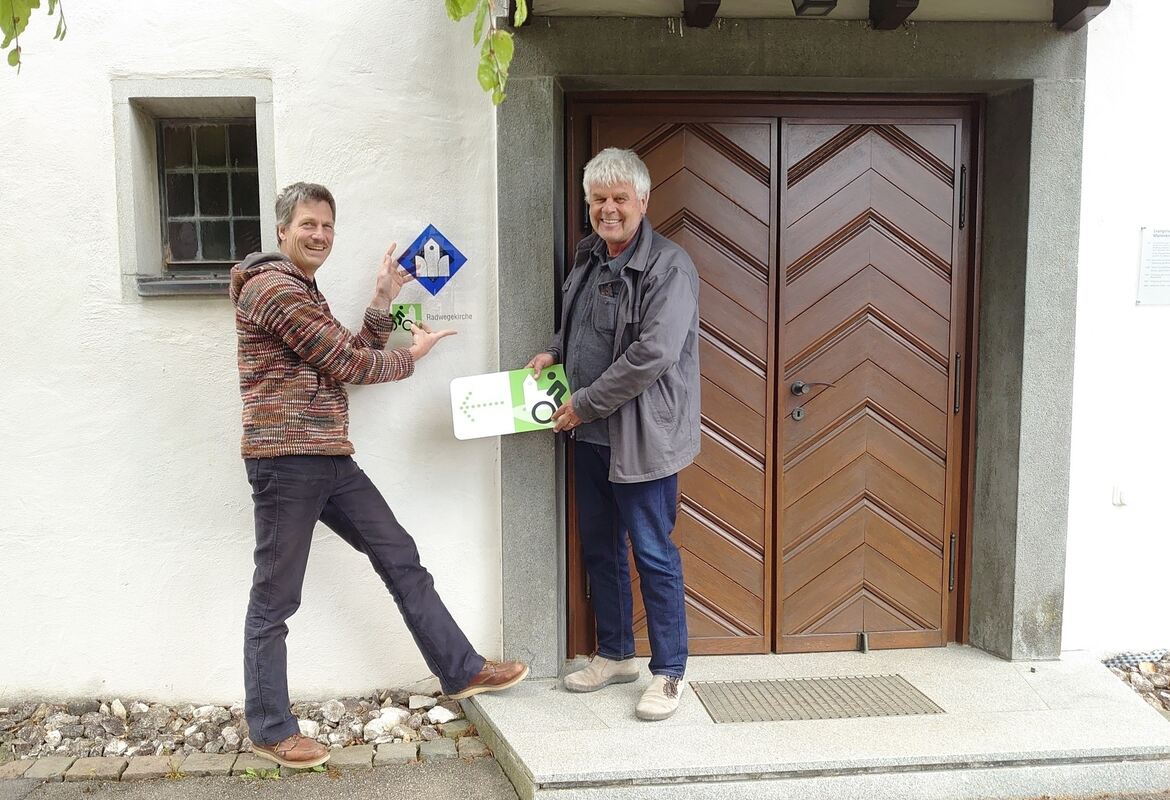 Pfarrer Martin Breitling und Kirchengemeinderat Rudi Giest-Warsewa schrauben das Symbol »Radwegekirche« an die Marienkirche in Kohlstetten.