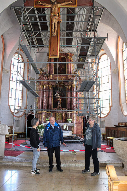 Lagebesprechung vor eingerüstetem Chor (von links): Kirchenpflegerin Kerstin Schweitzer, Pfarrer Wolfgang Jäger, Architektin Stefanie Mayer.