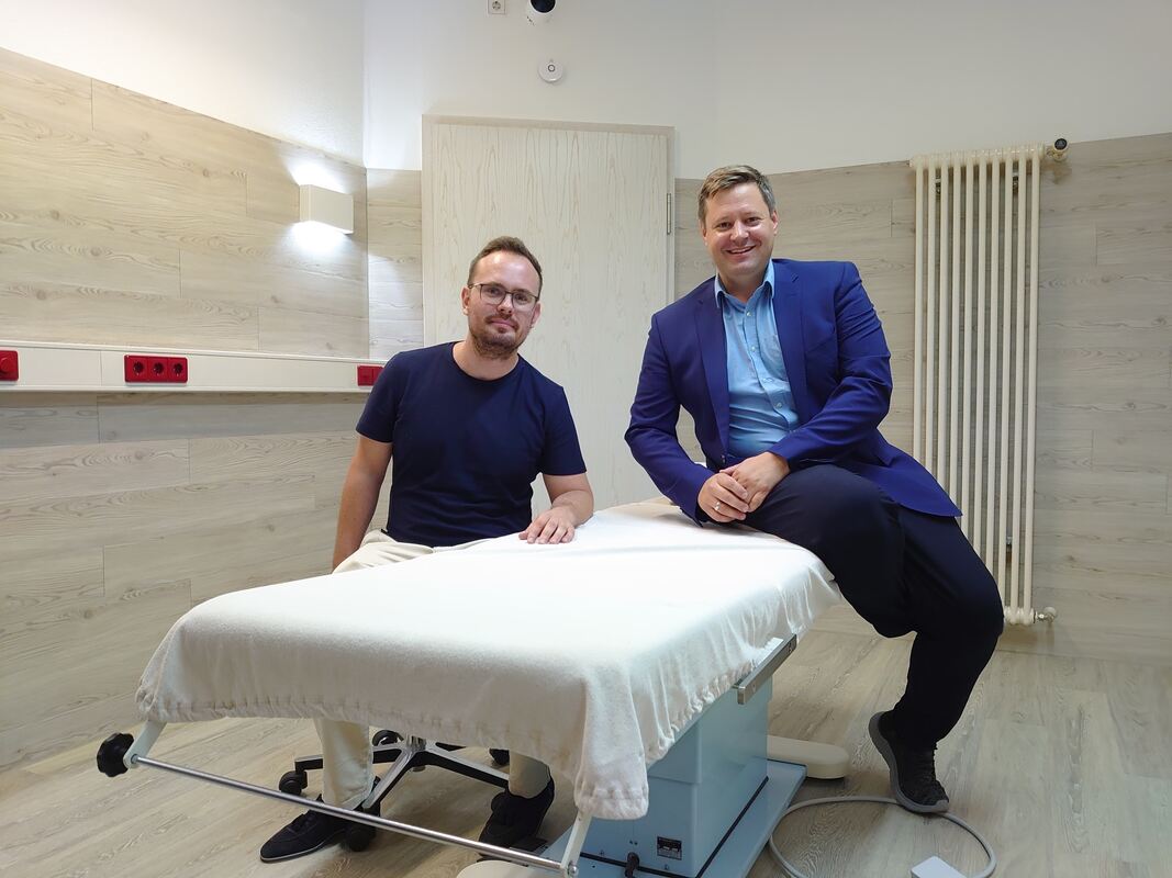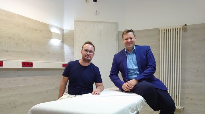 Dr. med. Johannes Pawlowski (links) und Bürgermeister Andreas Schmidt in den noch unfertigen Räumen der Praxis »Albderma«.