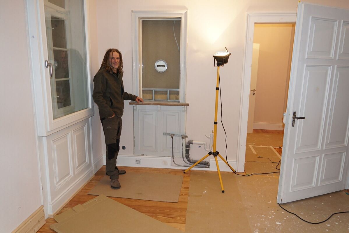 Gemeinderat Bernd Strasser in der ehemaligen Wartehalle des Bahnhofs Gomadingen. Der einstige Fahrkartenschalter musste nach den Vorgaben des Denkmalschutzes erhalten bleiben. Ebenso das benachbarte Originalfenster von 1893 (links), das eine isolierte Ummantelung erhielt. Von außen ist der Bahnhof schon ein Schmuckstück. FOTOS: LENK