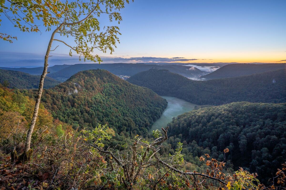 Das Ermstal von der Traufkante aus gesehen: Der Blick vom Rutschenfelsen ist eines der Motive, die es in den Kalender geschafft