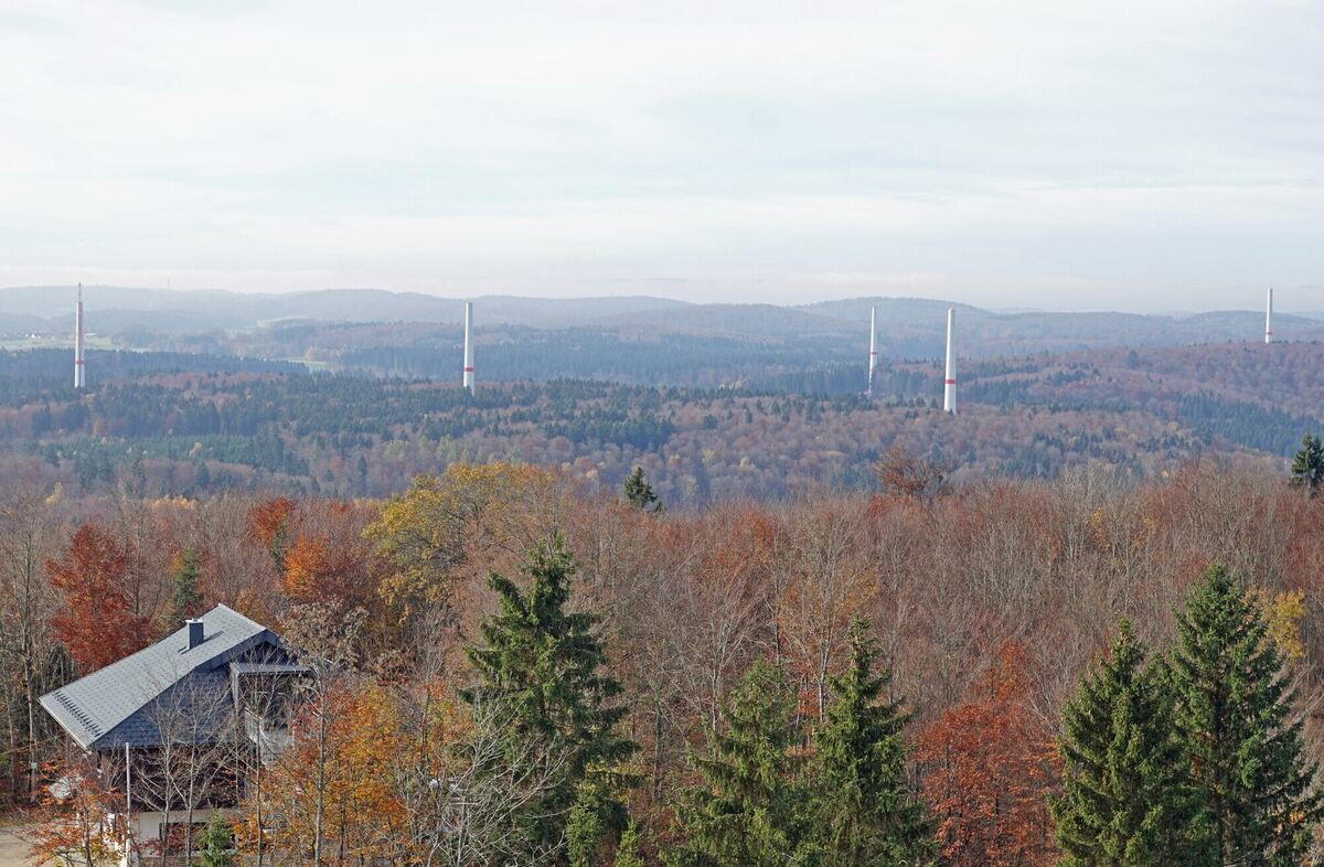 Vom Sternbergturm aus sind die fünf derzeit entstehenden Windkraftanlagen auf Gomadinger Gemarkung gut zu sehen. Die Betonsegmente sind je 90 Meter hoch.