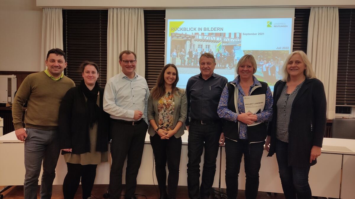 Gruppenfoto des Abschlussworkshops zum LandMobil-Projekt: Hans-Peter Engelhart, Rebecca Hummel (von links, beide Stadt Münsingen), Mario Storz (Engstingen), Jessica Baisch-Nipatsiripol (Landratsamt Reutlingen), Thomas Noack (Stadt Münsingen), Karin Blum, Gabriele Queisser (beide Landratsamt Reutlingen). FOTO: LANDRATSAMT
