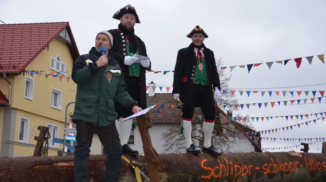 TROCHTELFINGEN-STEINHILBEN. »Hauzich, Fasnet oder Leich’, wa m’r feirat, des isch gleich. Hauptsach isch der süße Tromm vo’ma graußa Narraboom,« reimte Revierförster Martin Tschöpe am Rosenmontagmorgen in schönstem Schwäbisch. Seit vielen Jahren lässt er es sich nicht nehmen, bei der traditionellen Versteigerung des Steinhilber Narrenbaums »sein« Waldgewächs vorzustellen. 3,26 Festmeter Baum samt Spitze, das müsse mindestens 300 Euro geben, gab er der Narrenschar eine grobe Richtung vor.