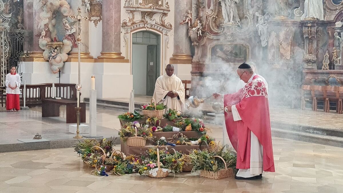 Ein volkstümlicher Brauch, der ins 9. Jahrhundert zurück reicht: Pfarrer Sigmund F. Schänzle weiht Kräuterbüschel.
