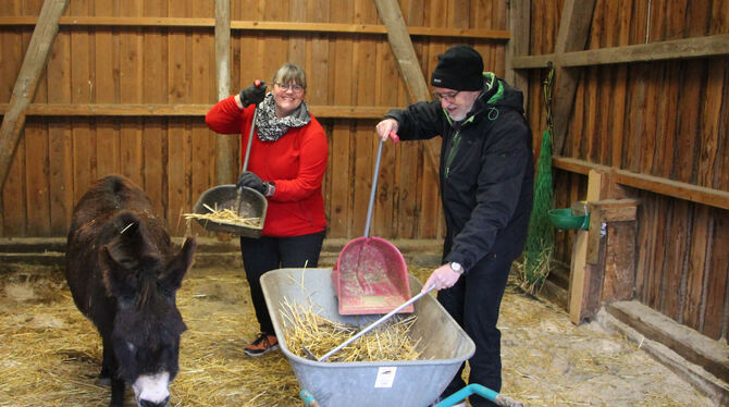 MÜNSINGEN. Die Aufgabenbereiche einer Bürgermeisterin sind vielfältig. Stallausmisten gehört gewöhnlich nicht dazu. Hayingens Bürgermeisterin Ulrike Holzbrecher war bei eisiger Kälte und schneidendem Wind am Gustav-Werner-Tag, der 2024 auf den Frauentag fiel, mit landwirtschaftlichem Gerät bei der tiergestützten Pädagogik der BruderhausDiakonie in Buttenhausen anzutreffen. Am Frauentag mache sie immer bei einer Aktion mit, erzählte sie.