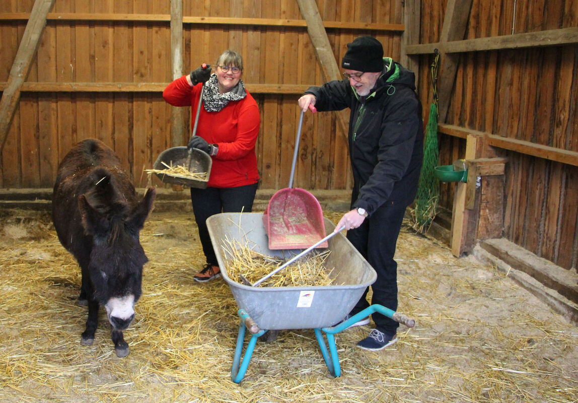 Von den »Eselexperten« Andy und Andrea, beide Beschäftigte in den Werkstätten, ließ sie sich zeigen, was an diesem Morgen im Stall zu tun war: Eseläpfel aufsammeln, Tiere füttern, Futtersäcke stopfen und – als Sahnehäubchen nach der staubigen Arbeit – ein Rundgang mit Eseln und Pony. »Ich bin auf dem Land aufgewachsen«, sagte Holzbrecher, während sie Mist in die Schubkarre fallen ließ. Mit Pferdeäpfeln fremdele sie nicht. »Mir geht es hier sehr gut.« Mehr noch als für die Arbeit interessierte sie sich jedoch für ihre Kollegen an diesem Tag: wo sie arbeiten, wo sie wohnen und wie sie zur Arbeit kommen. Beim Striegeln eines Esels hätte sie gern jeden Strohhalm und Heurest aus dem Fell entfernt: »Ist das ein Gefussele.« Professor Dr. Christian Rose, stellvertretender Stiftungsratsvorsitzender, der sie begleitete, neckte: »Das ist eine Geduldsübung für eine Bürgermeisterin.« »Ja, an meiner Geduld arbeite ich noch«, gestand Ulrike Holzbrecher.