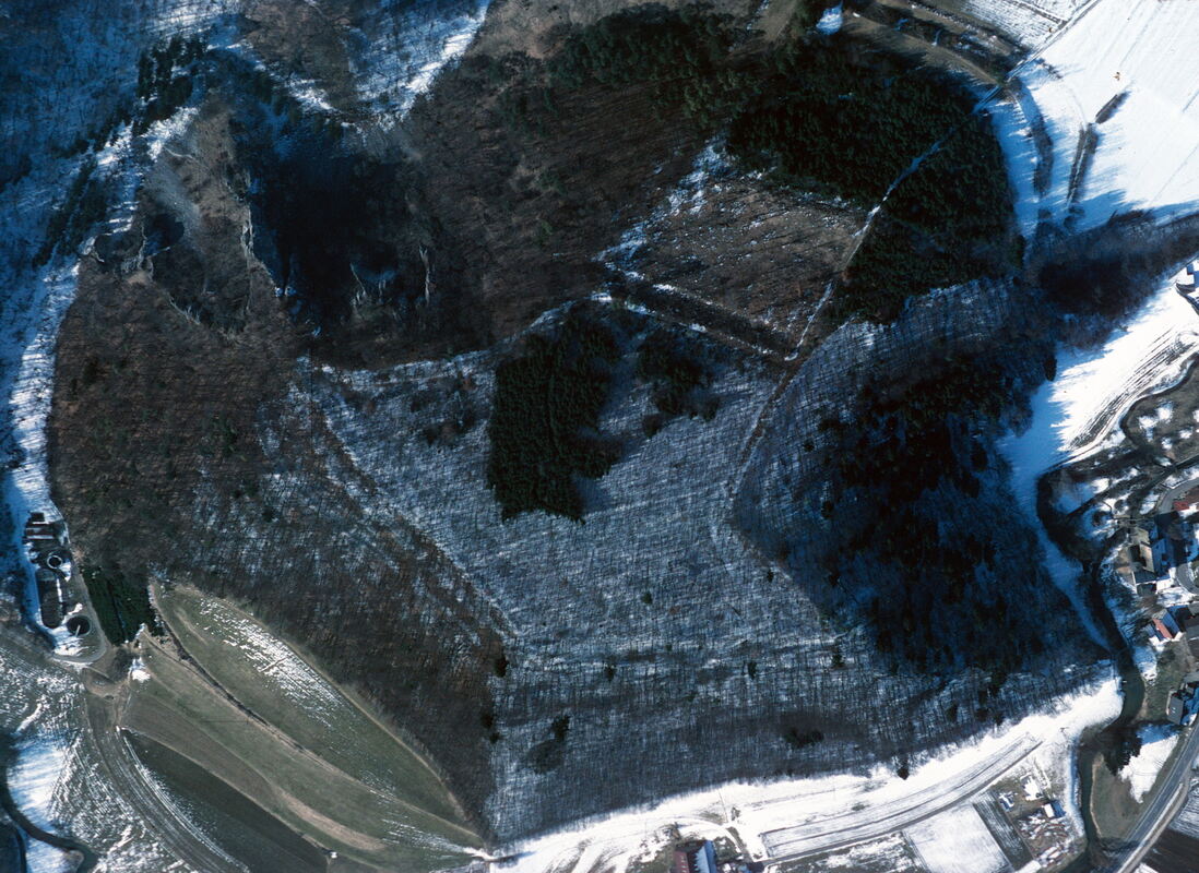 Luftbild von Althayingen (rechts Indelhausen) mit der fünfeckigen Kernanlage und dem Vorbereich.