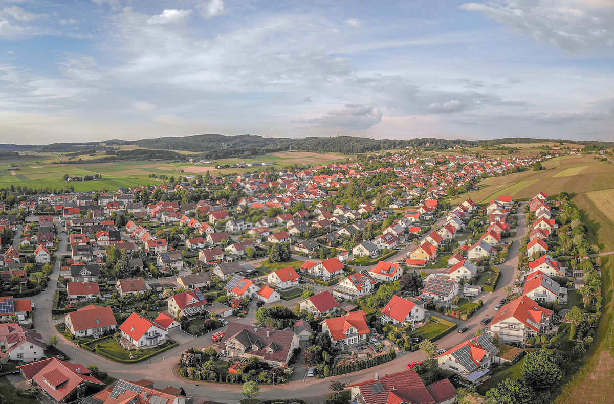Auingen aus der Drohnen-Perspektive: Das Dorf ist in den vergangenen Jahrzehnten um etliche Neubauten gewachsen. FOTO: DEHNE
