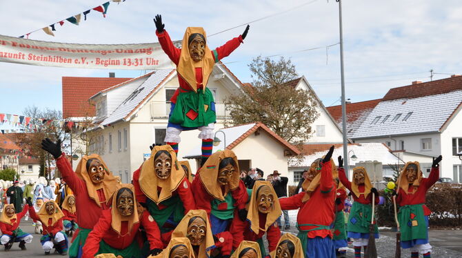 TROCHTELFINGEN-STEINHILBEN. Klein und kurzweilig, heimelig und unterhaltsam präsentierte sich der Sonder-Umzug zum vielfachen Jubiläum am Samstag Nachmittag. Über 1 000 Hästräger samt närrischen Musikern, Gruppen und Wagen zogen an zahlreichen Besuchern vorbei, die sich am Straßenrand bei idealen Wetterbedingungen postierten. Narrenrufe animierten zum Mitmachen, forderten lautstarke Antworten auf Schlippr-Schlappr, Rälle, Narri und Horig.