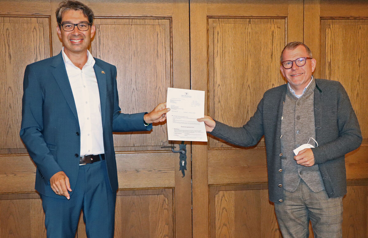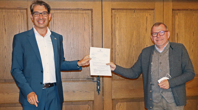 Staatssekretär Andre Baumann (links) überreichte den Förderbescheid für die Sanierung der Regenüberlaufbecken an Bürgermeister Mike Münzing persönlich.