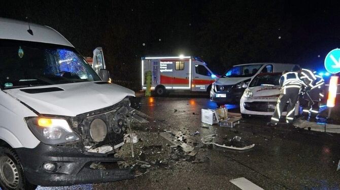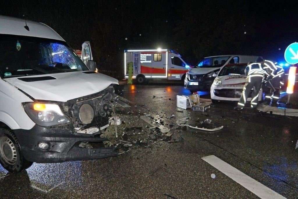 Durch die Kollision mit einem Transporter wurde der PKW zur Seite geschleudert und prallte gegen einen an der Einmündung stehenden weiteren Transporter eines 41-Jährigen. Der 19-jährige Unfallverursacher sowie der 30-Jährige und sein 33 Jahre alter Mitfahrer mussten vom Rettungsdienst zur medizinischen Versorgung in mehrere Kliniken gebracht werden.