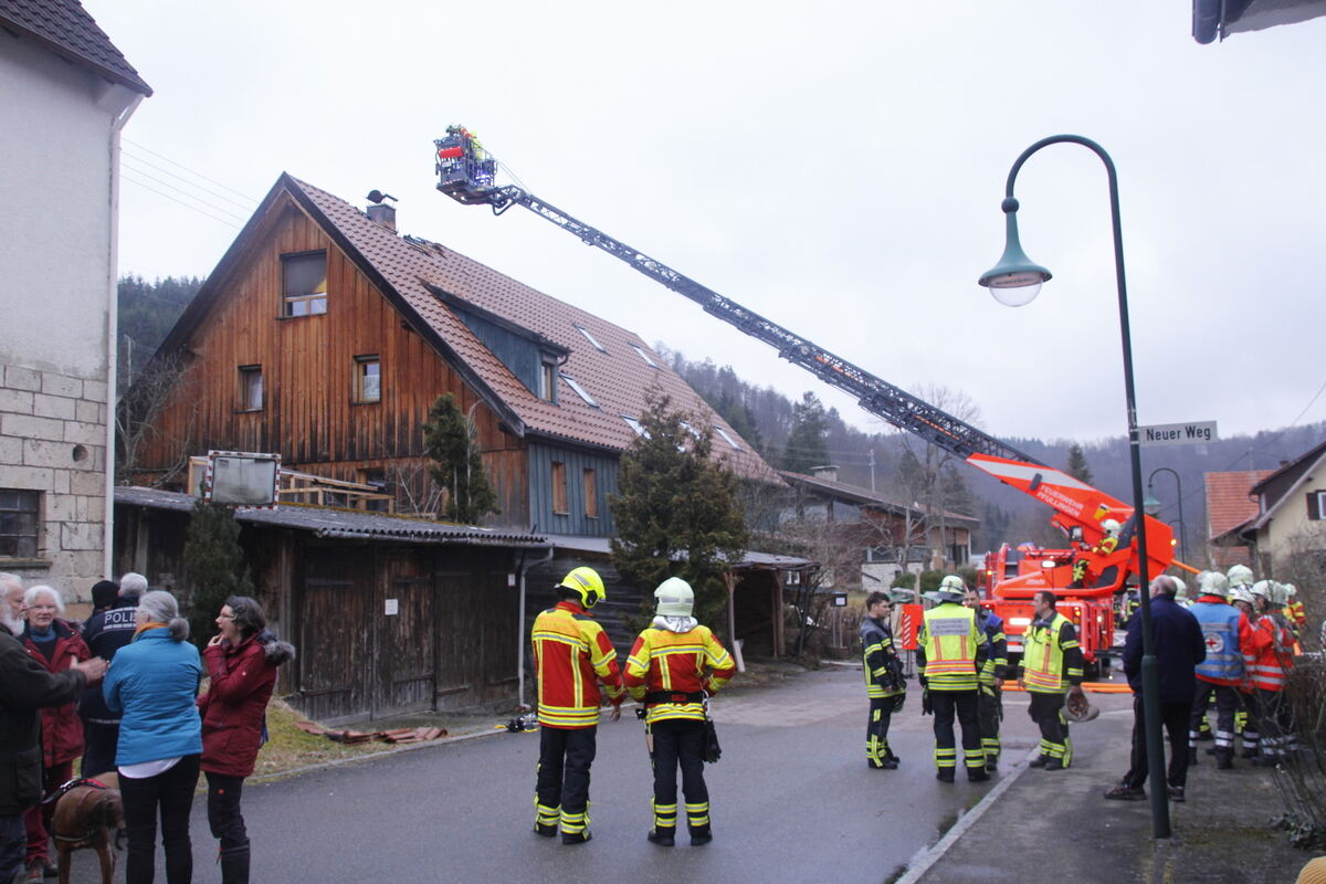 Kurz nach 16 Uhr ging der Alarm bei der Leitstelle in Reutlingen ein. Beim Eintreffen der Sonnenbühler Feuerwehr, die laut Vizekommandant Joachim Maier innerhalb kürzester Zeit mit neun Fahrzeugen vor Ort war, schlugen die Flammen schon aus dem Dach heraus. Die ebenfalls alarmierte Feuerwehr Pfullingen kam mit drei Fahrzeugen, darunter die Drehleiter, zu Hilfe. Insgesamt 50 Feuerwehrleute waren im Einsatz. Das DRK war mit sieben Fahrzeugen zugegen.