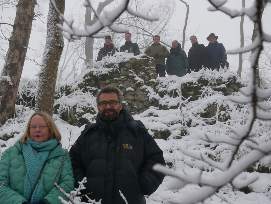 Über 80.000 Euro vom Land für die Erforschung von Burgen in der Region freuten sich am letzten Tag vor Weihnachten: Sigrid Hirbodian neben Wolfgang Bauer (vorne) und (hinter der Burgmauer von links) Marlene Karl, Michael Dieth, Manuel Hailfinger, Cindy Holmberg, Michael Kienzle sowie Uwe Morgenstern.