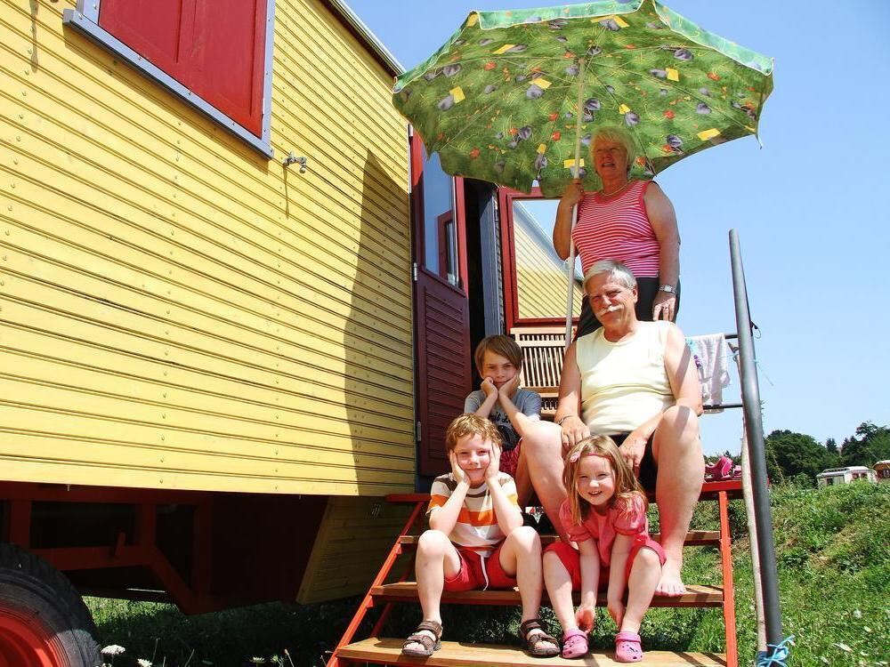 Zirkusleben im Wagen auf Zeit: Jutta und Ulf Kuhk machen mit ihren Enkeln Ida, Phil und Moritz Kurzurlaub auf der Hopfenburg.