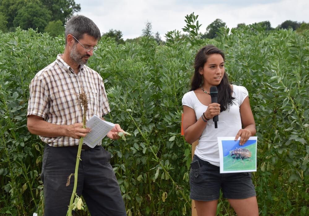 Ökofeldführung im Ackerbohnenwald. Pflanzenbauberater Wendelin Heilig mit Leguminosenforscherin Verónica Schmidt-Cotta vom Netzwerk Bohne/Erbse.