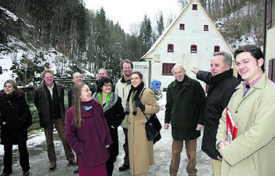 Kultur-Interessierte, die am Kulturprogramm der Wimsener Mühle arbeiten: von links Walburg Speidel vom Geopark Schwäbische Alb, Stefan Hartmaier, Andreas Ruess, Thomas Lautenschlager, Dr. Lutz Dietrich Herbst, vorn, von links Dr. Dorothee Ade-Rademacher, Beate Rimmele, Karin Sieber-Seiz, Roland Freiherr von Saint-André, Zwiefaltens Bürgermeister Hubertus-Jörg Riedlinger, Daniel Tress.