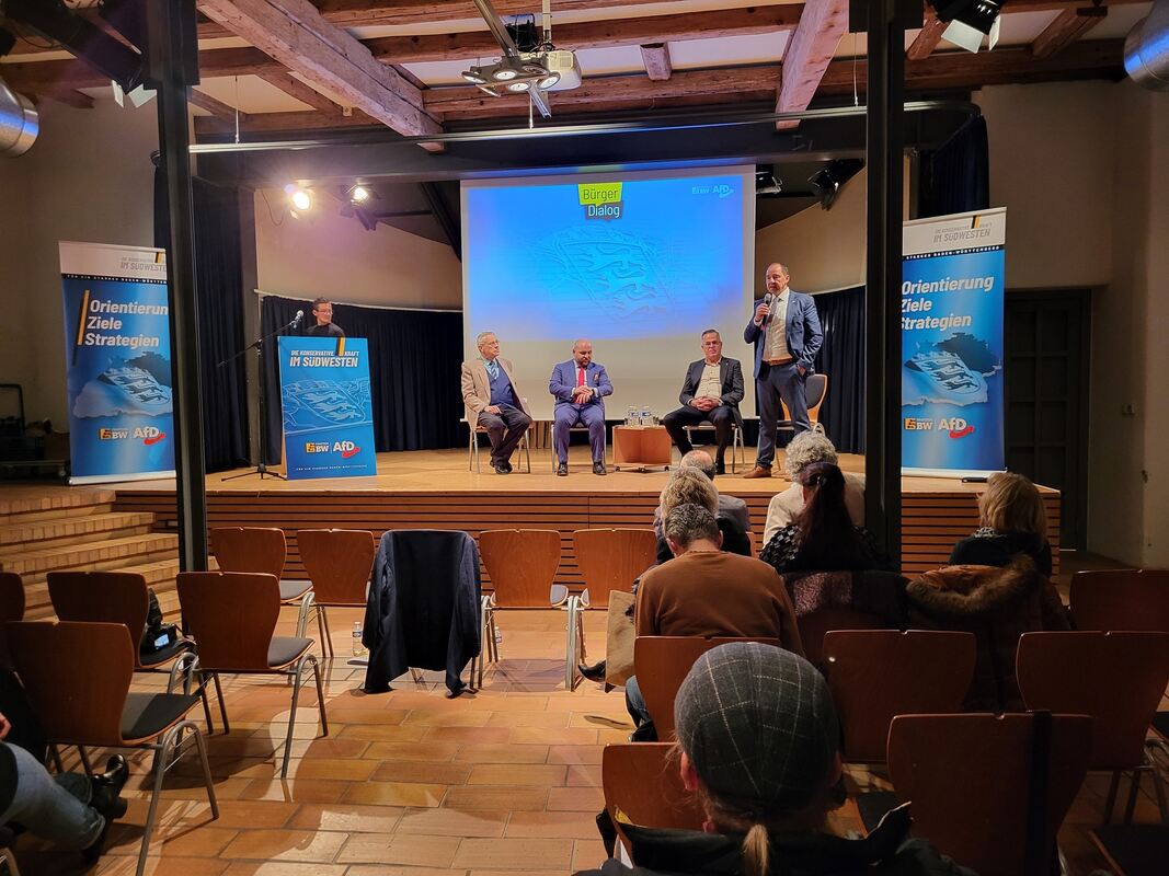 Am Eingang musste man sich erst einmal einer Leibesvisitation unterziehen, auch hier wollte man scheinbar kein Risiko eingehen. Mit den Landtagsabgeordneten Hans-Jürgen Goßner, Joachim Steyer, Hans-Peter Hörner und dem Bundestagsabgeordneten Markus Frohnmaier holte die AfD vier Redner auf die Bühne, die sich zu aktuellen Themen positionierten. Goßner beklagte das »mangelnde Sicherheitsgefühl im Land«. Hans-Peter Hörner ging auf die »mangelhafte Bildungspolitik« in Baden-Württemberg ein, will anstatt in Migration, Entwicklungshilfe oder unnütze Kampagnen wie »The Länd« lieber Geld in Bildung investieren. Joachim Steyer ging in seinem Vortrag auf das Heizungsgesetz ein und bezeichnete dieses als »Bankrott-Erklärung der Bundesregierung«, die Klimakrise als »Panikmache und Manipulation«. Von einer »Wählerverarsche« sprach Markus Frohnmaier und bezog sich damit auf den verfassungswidrigen Bundeshaushalt.