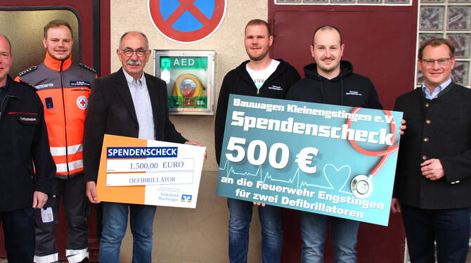 Freuen sich über den neuen Defibrillator: Timo Glück (Feuerwehr, von links), Nico Bayer (DRK), Uli Kaufmann (Sauerbrunnenhockete), Michael Möck und Simon Dollinger (beide Bauwagen Kleinengstingen) und Bürgermeister Mario Storz. FOTO: LEIPPERT