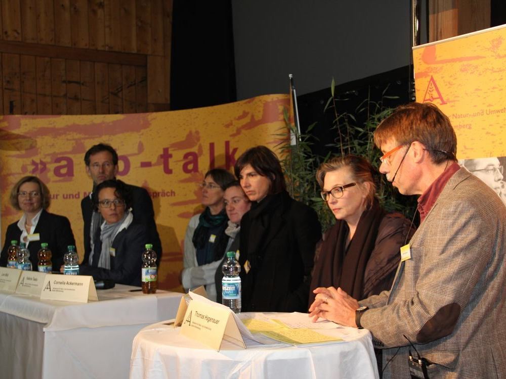 Alb-Talk-Runde (von links): Sabine Lund, Hendrik van Woudenberg, Adrienne Braun, Lore Wild, Valérie Testu, Cornelia Ackermann, Ulrike Böhme und Moderator Thomas Hagenauer.