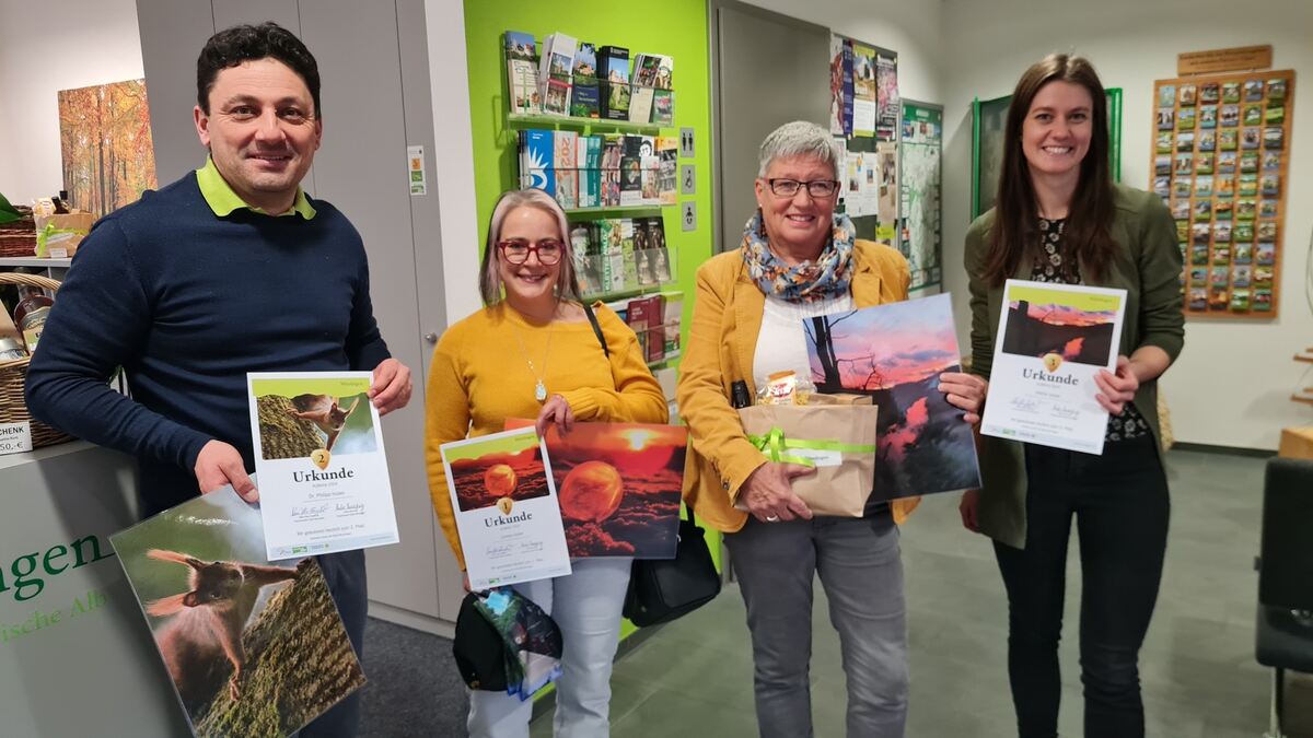 Hans-Peter Engelhart (links) und Anke Schmid (rechts) von der Münsinger Touristik Information überreichten Carmen Goller (zweite von links, Platz 1) und Helma Leuze (Platz 3) ihre Preise.